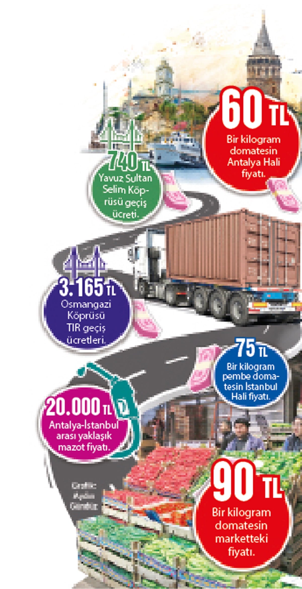 Antalya’dan İstanbul’a gelen bir pembe domatesin kilogram fiyatı 60 TL iken İstanbul’da bu fiyat 75 TL’ye yükseliyor ve markette 90 TL’ye kadar çıkabiliyor. Bir TIR’ın bin kilometrelik taşıma maliyeti ortalama olarak 50-70 bin TL arasında değişirken kilogram başına düşen nakliye maliyeti ise 2.8 TL ile 5 TL arasında değişmektedir. Nakliye maliyetleri sebze ve meyvenin çabuk bozulabilen ürünler olmasından dolayı artmaktadır.